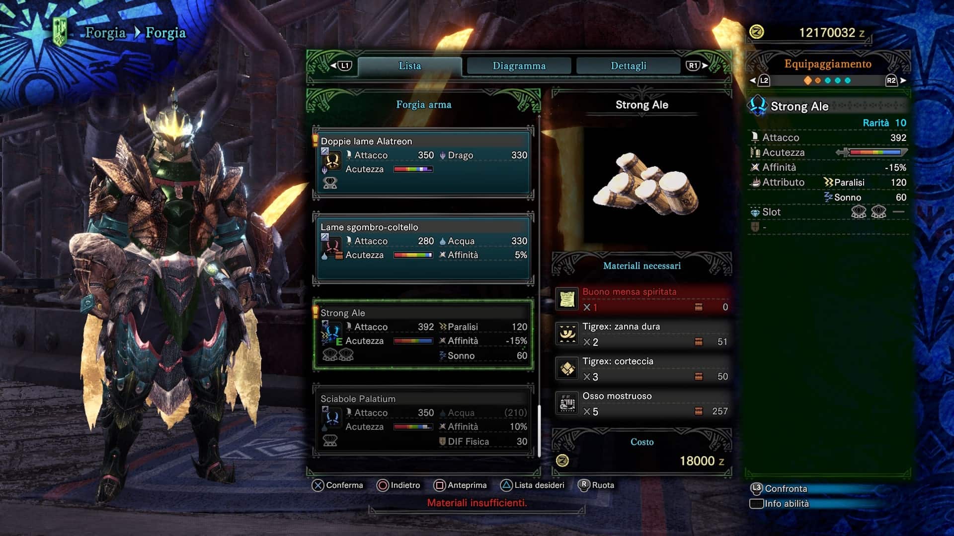 Sconfiggendo questo Tigrex dalle dimensioni gargantuesche, riceverete il Buono Mensa Spiritata utile per forgiare le doppie lame Strong Ale, che una volta potenziate diventeranno Master Ale, con status paralisi-sonno e dalla forma di enormi boccali di birra. Otterrete inoltre la corona dorata del mostro.![]()