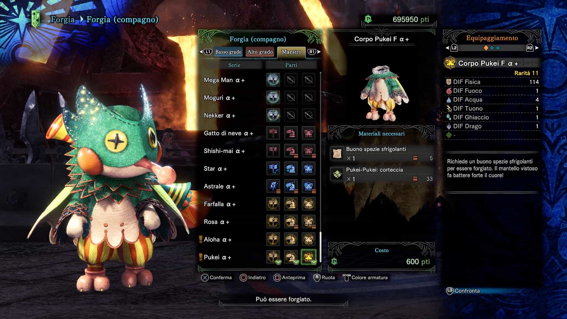 Per lui infatti ci sarà l’equipaggiamento Pukei (si, si chiama come l’armatura del mostro) al costo di 3 buoni più alcuni materiali, nonchè la versione Master Rank dell’equipaggiamento Aloha del festival estivo di Astera.