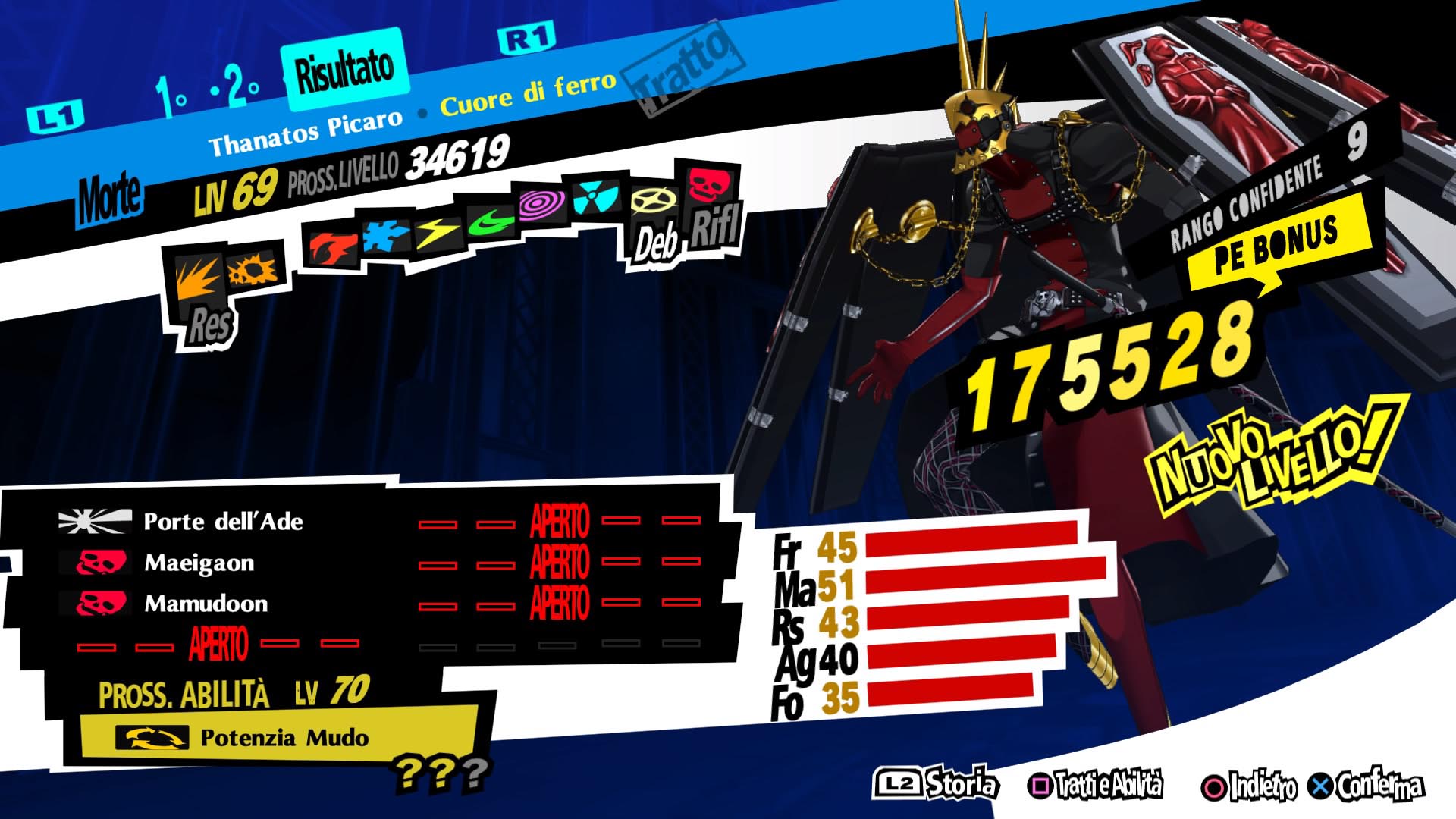 Come mostrato nello screen d’esempio, nel mio caso ho il confidente della Morte (Takemi Tae) di rango 9 e ciò si traduce in abbastanza punti esperienza da far livellare Thanatos Picaro a fusione avvenuta.