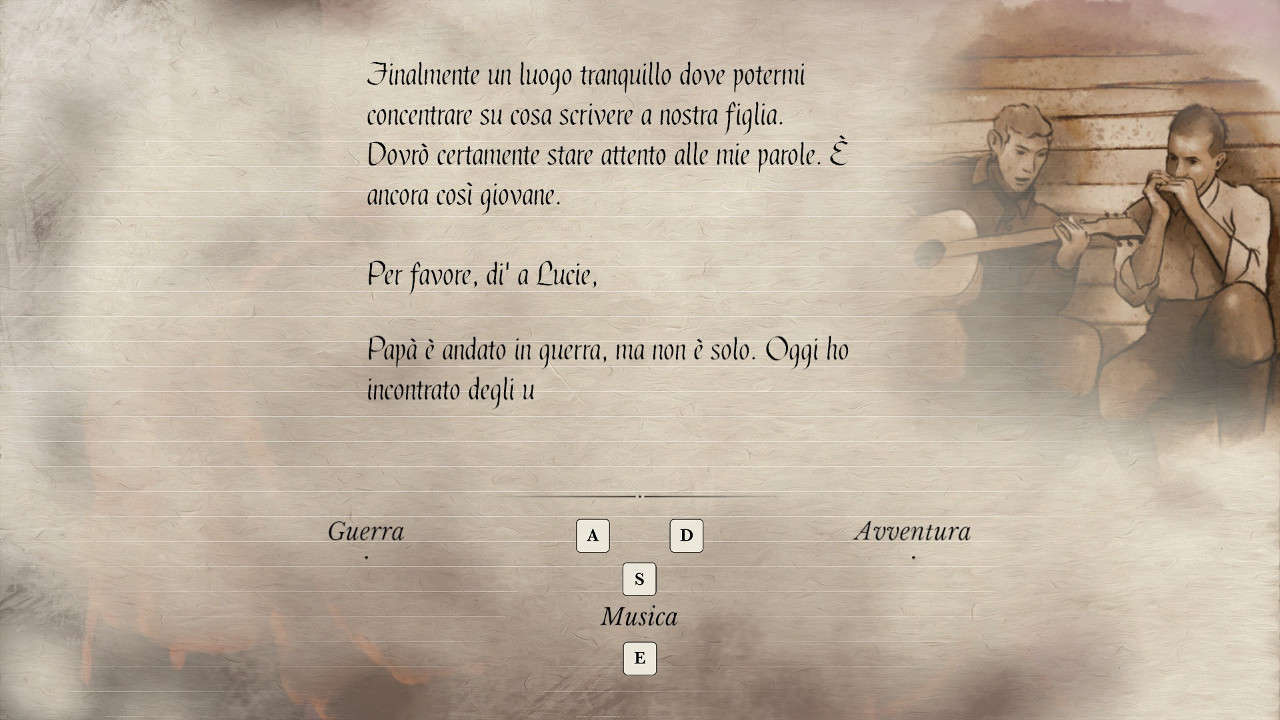 Azione quasi nulla ed enigmi semplicissimi permettono di concentrarsi esclusivamente sulla narrazione, e di lasciarsi trasportare nella storia, fino a un finale di gioco (che coicide con la fine della guerra) tra i più toccanti che mi siano mai capitati, e che propone alcune scelte davvero, davvero, difficili. E nessuna di esse conduce al finale “positivo”, per il semplice fatto che un’esperienza così devastante come la guerra lascia cicatrici indelebili nelle vite di chi ne viene coinvolto. Per i giocatori più esigenti, però, è prevista una serie di collezionabili da trovare esplorando le aree o da ottenere in vari modi (giocando a carte contro vari personaggi, ad esempio).