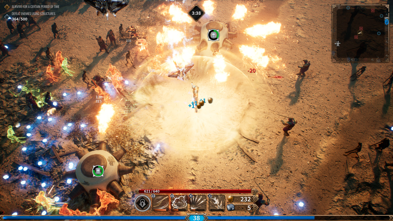 Tornando al gameplay, raccogliendo esperienza dai nemici caduti otterremo nuovi livelli con cui potenziare le nostre caratteristiche, ogni circa 5 livelli otterremo un nuovo potere a scelta tra quelli proposti e via così, in un loop che spinge il giocatore a potenziarsi sempre di più fino a diventare una macchina da guerra inarrestabile. Per mantenerci comunque impegnati durante la nostra marcia di morte, avremo postazioni da costruire consumando i materiali in roccia raccoglibili per terra o tramite la postazione di miniera. Ognuna delle costruzioni possiede un tipo di effetto diverso tra supporto, torretta e forgia (quest’ultima utile per potenziare le armi ogni 5 livelli e disponibile solo quando è necessaria). Avremo anche delle attività casuali come nemici speciali, basement (sotterranei) da occupare per potenziare il personaggio, casse da aprire per ricevere oro e oggetti speciali, e rift (squarci dimensionali… credo?) da rubare, ovvero dei portali da cui escono nemici forti che come ricompensa vi permette di ottenere un potenziamento per gli effetti delle armi. Ogni spedizione avrà poi obbiettivi diversi sia principali che secondari, con un limite di 20 minuti che non capisco se siano troppi, soprattutto col fatto che non puoi sospendere la partita (follia, ndr.), o troppo pochi perché alcuni obiettivi, basati su meccaniche casuali, sono veramente difficili da completare entro la fine della missione.