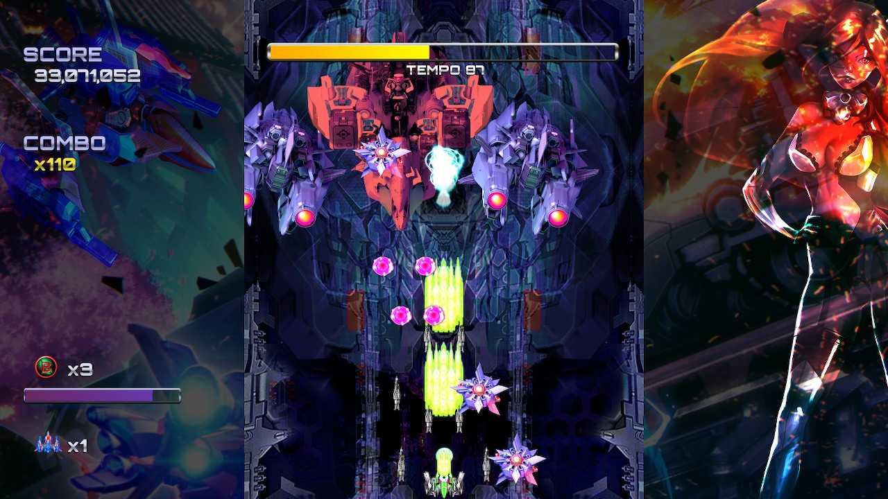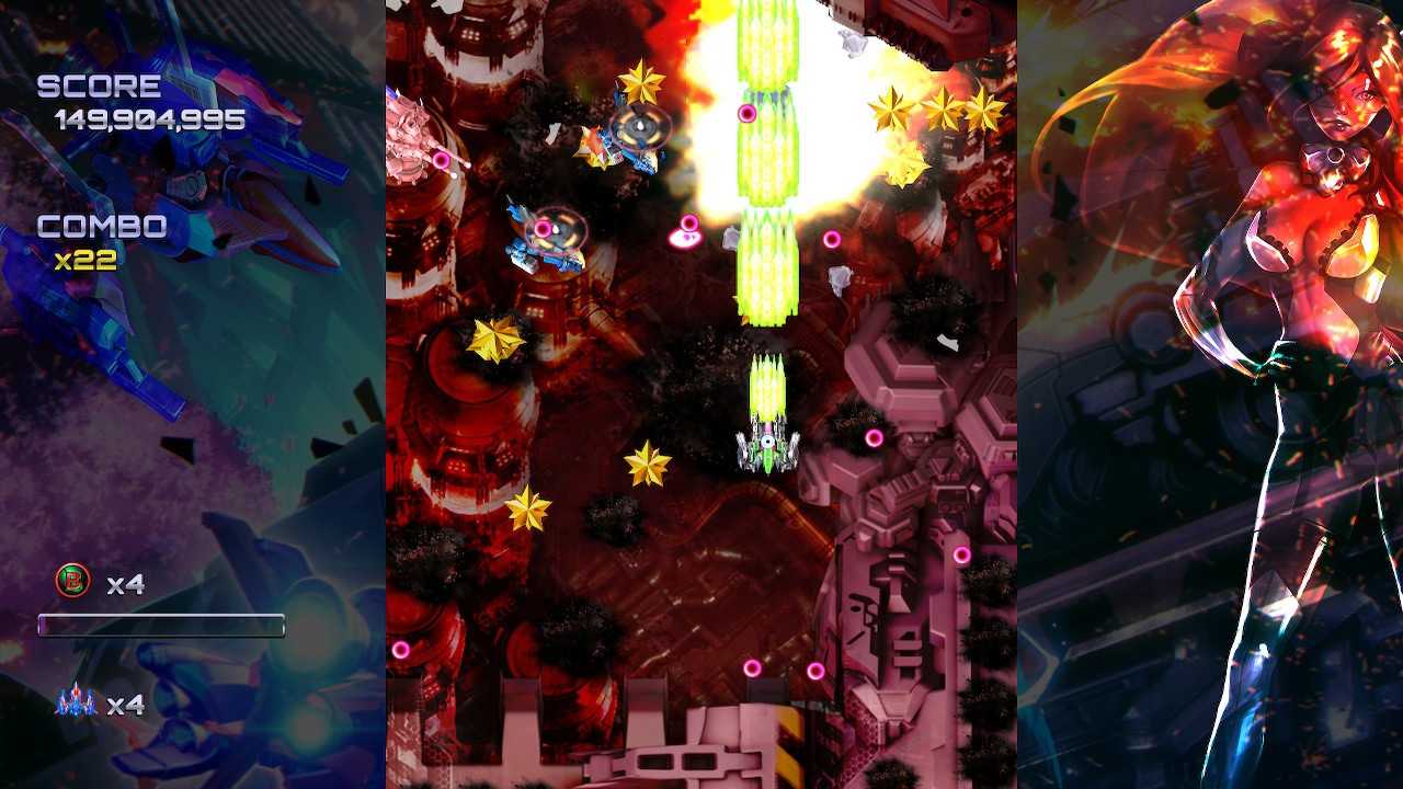 Il gioco si dipana tramite i cinque livelli presenti, in cui ci faremo strada grazie all’uso della levetta di movimento e di tre tasti, uno dei quali dedicato alle solite bombe utili a dare una ripulita allo schermo spazzando via tutti i proiettili nemici e gli altri due alle due diverse modalità di fuoco: quella normale e quella concentrata, quest’ultima in particolare ci garantirà un output di danno notevolmente superiore, ma finirà per rallentare inevitabilmente la velocità della nostra navetta, utile ad ogni modo per destreggiarsi nelle fasi più caotiche. Infatti, come al solito, la levetta del JoyCon non si dimostra un dispositivo di input preciso: avere meno velocità permette spostamenti più precisi in mezzo al marasma. Consiglio sempre di approcciarsi a questi giochi con un Arcade Stick, se possibile.