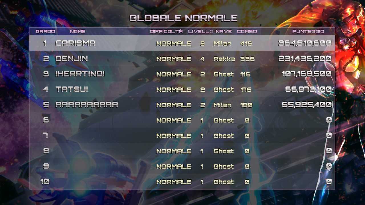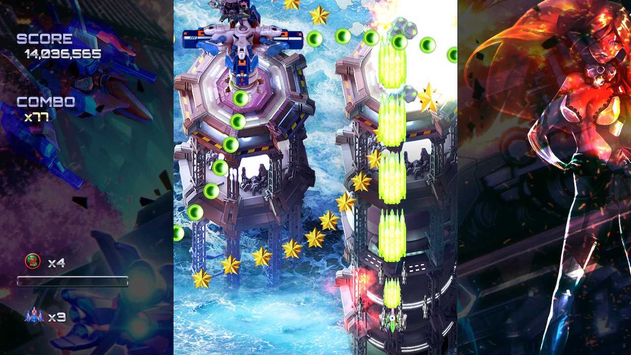 Ogni nemico abbattuto rilascerà due tipi di valuta, che verranno automaticamente raccolti dal nostro avatar quando saremo in prossimità di essi (letteralmente calamitandoli da una distanza notevole). Le stelle, che ci forniranno punteggio, e una sorta di meteoriti verdastri (o qualcosa del genere, non ho ancora ben capito che diamine siano), i quali serviranno ad aumentare il combo meter, che moltiplicherà i nostri punti ottenuti abbattendo nemici. Inoltre, una volta sconfitto un nemico di medie dimensioni, tutti i proiettili da esso sparati saranno istantaneamente convertiti in stelle, ripulendo ulteriormente lo schermo di gioco. Ottenere punti ci permetterà di riempire un’apposita barra che ci fornirà bombe o vite extra.