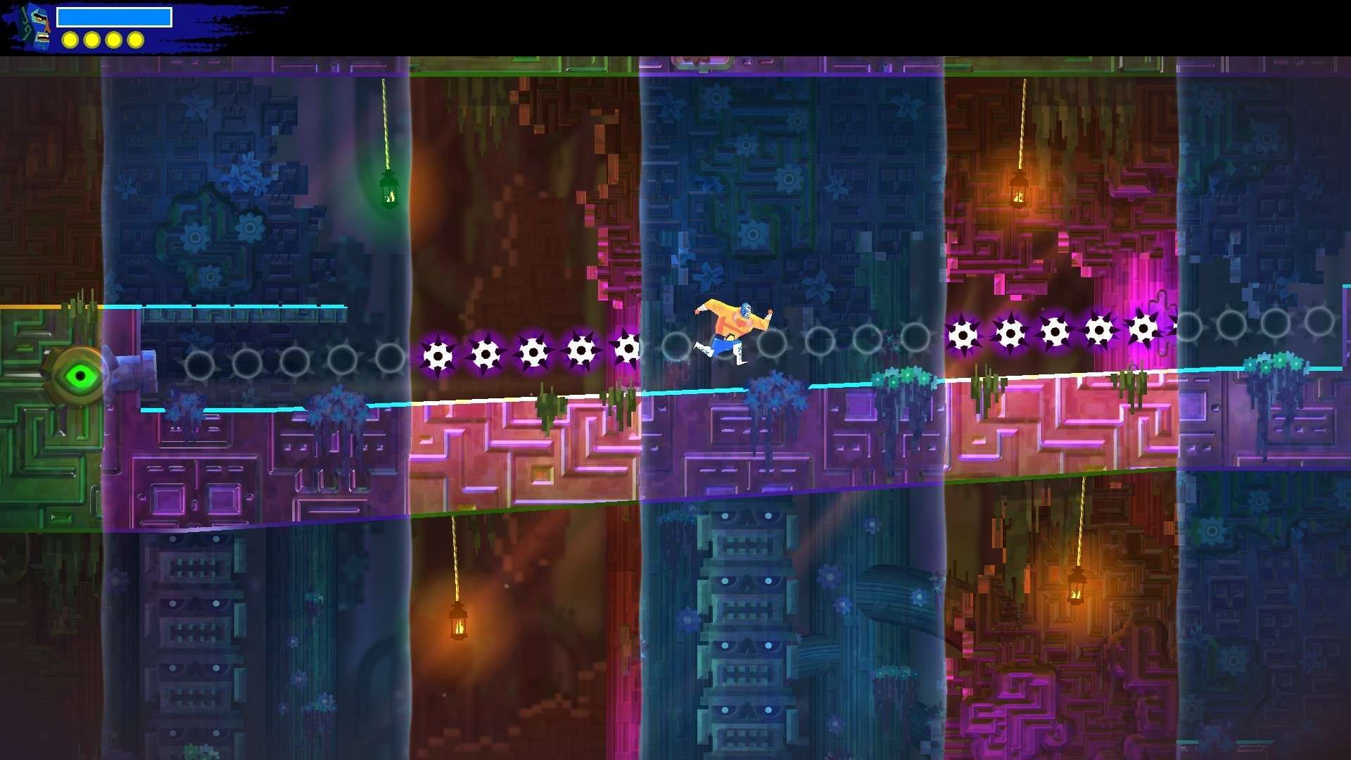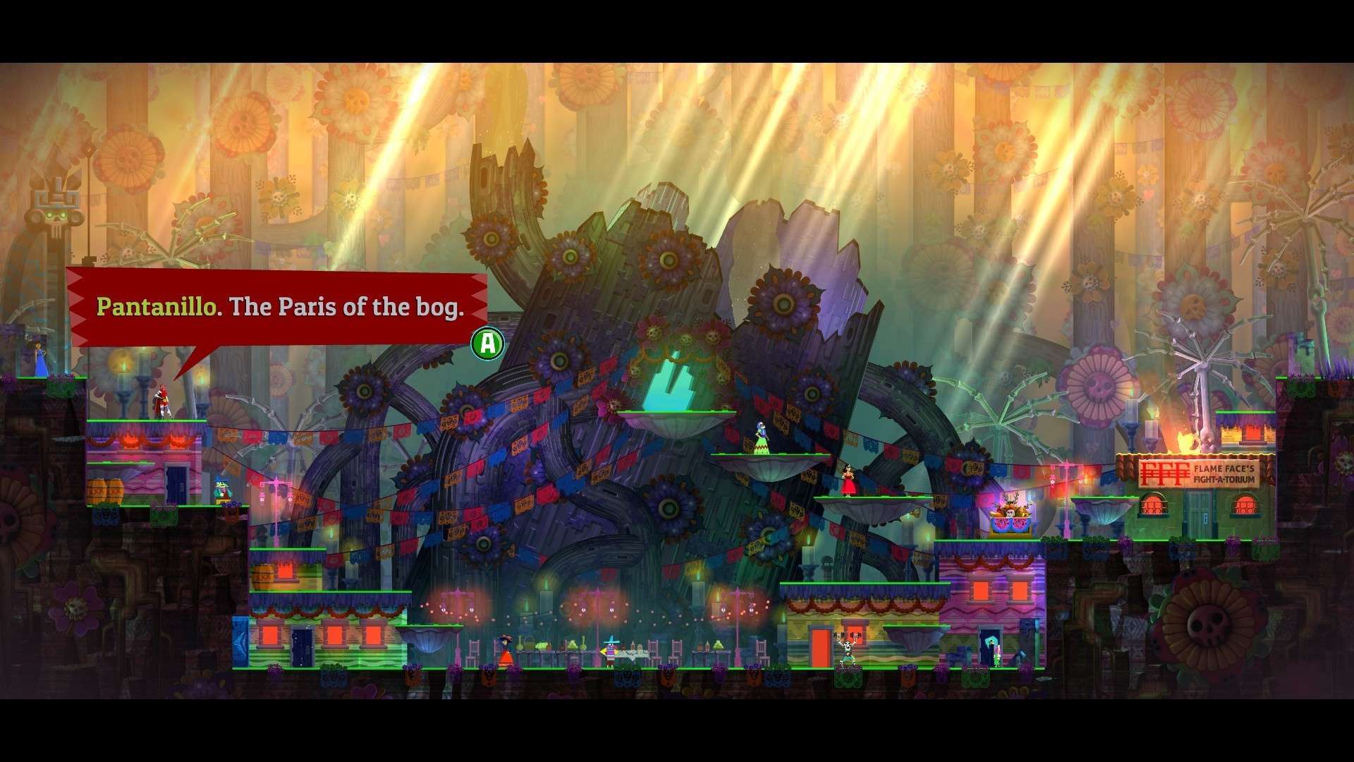 La magia di Guacamelee! 2 (e del precedente, per derivazione) è la raffinatezza con cui fonde metroidvania e combattimento. Quasi tutti gli upgrade sparsi per il mondo sono mosse di combattimento: quando se ne acquisisce una nuova c’è l’euforia di avere un nuovo modo di tirare schiaffi, oltre a poter aprire porte di un nuovo colore. Perfino l’abilità di trasformarsi in pollo, per passare in spazi angusti (come la Morfosfera in Metroid) è stata ora parecchio ampliata, con un nuovo arsenale di combo e abilità. Se si vuole essere creativi ci si può trasformare in pollo durante le combo per continuarle con le sue mosse e viceversa.