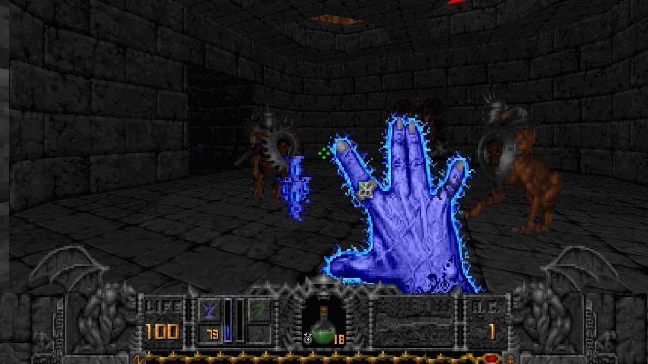 Heretic mantiene il cuore pulsante di uno sparatutto anni ’90, ma lo arricchisce con meccaniche che all’epoca lo distinguevano da Doom e dai suoi simili: un inventario di oggetti utilizzabili in qualsiasi momento, armi con effetti unici e poteri temporanei che possono cambiare il corso di uno scontro. La gestione dell’equipaggiamento non è un contorno, ma parte integrante della strategia: saper decidere quando usare un Tomo del Potere o una Fiala dell’Invisibilità è tanto importante quanto centrare un colpo di bacchetta.