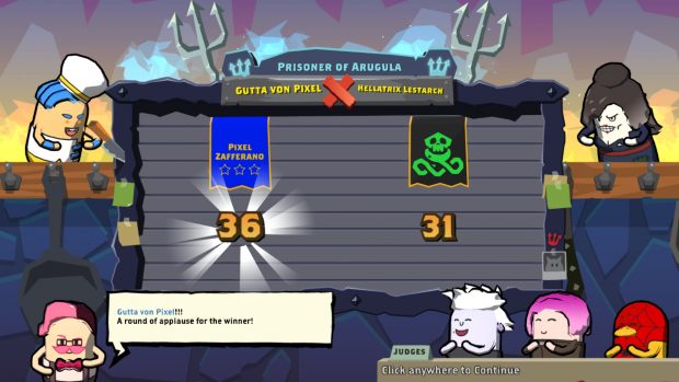 L’ultima componente del gameplay sono i duelli, in cui saremo chiamati a cucinare, di fronte a tre patate giudici, contro un avversario, diverso a ogni sfida. Il piatto andrà scelto con cura in base ai gusti dei singoli giudici, liberamente consultabili, e, durante la preparazione, potremo cercare di distrarre il cuoco rivale spedendogli contro il nostro fido animale da compagnia (un maiale volante, ovviamente)… facendo attenzione, però, a non far finire la bestiola contro il nostro personaggio! Le sfide, simpatici parodie degli innumerevoli talent show a tema culinario, non costituiscono propriamente una sfida, dal momento sono tutte piuttosto semplici. Molto semplici. Troppo.