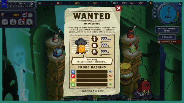 La maggior parte del gameplay, comunque, si svolge nel corso delle giornate di lavoro, in cui dovremo cucinare per i nostri divini clienti le sventurate anime delle patate peccatrici giunte all’Inferno. In sostanza, sarà nostro compito smistare le anime fornite dal Pit of Doom in varie stazioni, dove verranno cotte in quattro modi (fritte, bollite, al forno o rese purè) o trasformate in vari condimenti (sale, pepe, peperoncino e miele). Con gli ingredienti accumulati, infine, dovremo cucinare i piatti per le capricciose divinità, soddisfacendo i loro desideri, che spazieranno dalla richiesta di piatti più o meno complessi (ovvero, che richiedono più o meno ingredienti) o che raggiungano un rank minimo accettabile (dipendente dal numero degli ingredienti, ma anche dalla loro qualità). Ogni volta che una divinità sarà soddisfatta dai nostri piatti otterremo il suo Favore, una specie di seconda valuta, che potremo utilizzare per acquistare nuove stazioni, capaci di produrre alimenti di qualità maggiore o di cuocere più velocemente, o elementi aggiuntivi della cucina, come un bar in cui riciclare i piatti avanzati per produrre drink volti ad aumentare la pazienza delle divinità e renderle più propense ad attendere le pietanze ordinate. Ogni volta che la pazienza di un dio, rappresentata da una barra che si svuota progressivamente, raggiunge lo zero, il suo ordine sarà annullato, e perderemo un po’ del Favore accumulato. Se quanto detto finora avrà riportato alla memoria di qualche lettore il divertentissimo Cook, Serve, Delicious!, a differenziare un po’ l’esperienza di gioco è la presenza della possibilità, in Holy Potatoes!, di mettere in pausa il gioco mentre si smista un peccatore o mentre si sceglie cosa cucinare… con tutte le conseguenze che ne derivano, sia rispetto alla pianificazione dell’azione, sia rispetto alla frenesia del gioco. Ogni cerchio, inoltre, aggiungerà al gameplay qualche piccola variazione, come nuovi tipi di stazione acquistabili o vere e proprie feature aggiuntive, tra le quali spiccano le taglie che, ogni giorno, potremo riscuotere, identificando tra i dannati da smistare un ricercato, da spedire alla divinità che ha messo la taglia sulla sua testa.
