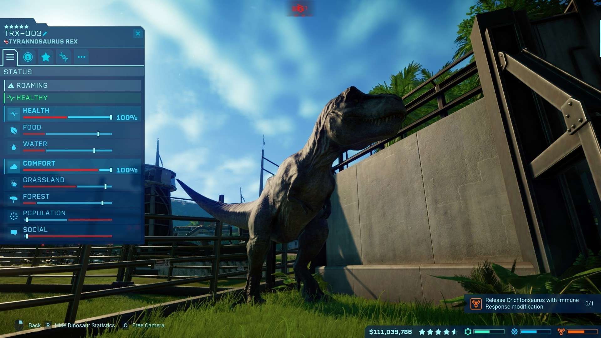Fin qui tutto bene e tutto nella norma, il livello di dettaglio è stellare, “l’effetto wow” c’è fin da subito e, come ho premesso, l’atmosfera di Jurassic Park si respira bene addirittura prima della costruzione dei recinti elettrificati. Poi arriva, si entra nel vivo: “Costruisci l’Hammond Center e rilascia il tuo primo dinosauro”.