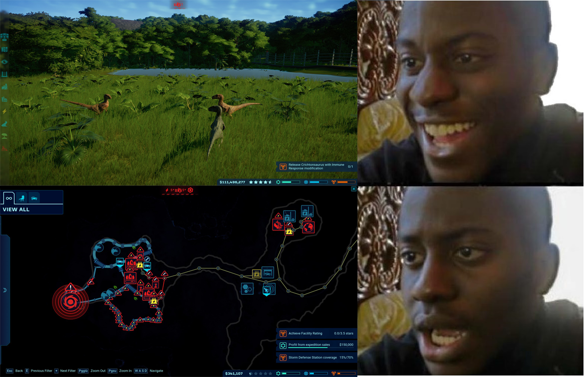 Vi faccio un esempio pratico: ultima isola, parco enorme pieno di bestie, tornado, scappano tutti. Se scappano tutti dovrete mandare gli elicotteri dell’ACU a tranquillizzarli e poi ordinare ai LENTISSIMI elicotteri da trasporto di riportarli all’interno dei recinti, mentre i ranger li riparano.
