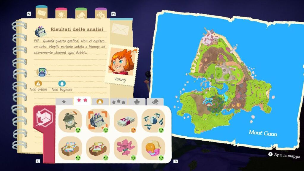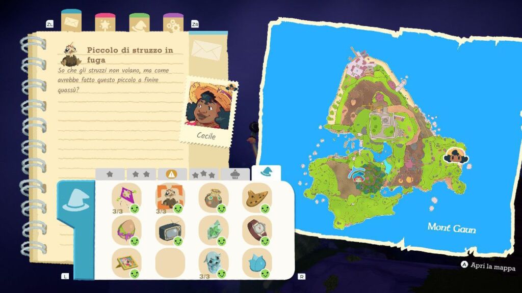 Durante il terzo giorno si attiverà il delizioso gameplay loop del titolo dove, tra una consegna principale e l’altra inizieremo a notare degli oggetti sparsi nella mappa con i quali interagire: questi varieranno tra oggetti persi da alcuni abitanti, in delle “missioni secondarie” dove dovremo riportare l’oggetto smarrito al suo proprietario senza sapere chi sia se non da qualche indizio nella descrizione, e alcune statuette collezionabili che fungeranno da valuta per sbloccare, interagendo con una fontana segreta. Ma anche nuovi adorabili costumi e ciondoli, vasi da rompere cadendoci sopra per collezionare tarocchi o delle postazioni magiche per sbloccare shortcut o scie estetiche per la nostra scopa. Questi obiettivi secondari, sparpagliati per l’isola, faranno sì che ogni volta che dovremo compiere un tragitto per fare una consegna, ci troveremo spesso a controllare in giro in cerca di altre cose da fare, in modo tale da non cadere mai nella noia e premiando il giocatore nella sua esplorazione che scoprirà anche meccaniche opzionali non spiegate dal gioco.