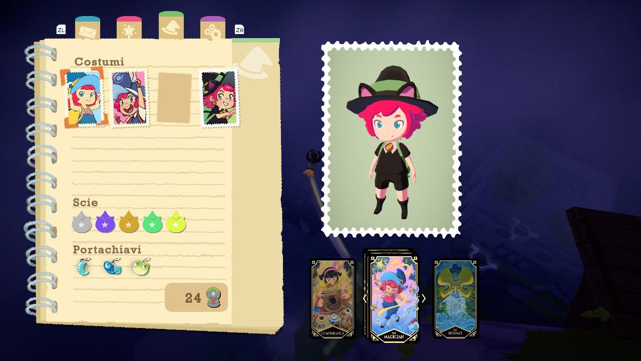 Durante il terzo giorno si attiverà il delizioso gameplay loop del titolo dove, tra una consegna principale e l’altra inizieremo a notare degli oggetti sparsi nella mappa con i quali interagire: questi varieranno tra oggetti persi da alcuni abitanti, in delle “missioni secondarie” dove dovremo riportare l’oggetto smarrito al suo proprietario senza sapere chi sia se non da qualche indizio nella descrizione, e alcune statuette collezionabili che fungeranno da valuta per sbloccare, interagendo con una fontana segreta. Ma anche nuovi adorabili costumi e ciondoli, vasi da rompere cadendoci sopra per collezionare tarocchi o delle postazioni magiche per sbloccare shortcut o scie estetiche per la nostra scopa. Questi obiettivi secondari, sparpagliati per l’isola, faranno sì che ogni volta che dovremo compiere un tragitto per fare una consegna, ci troveremo spesso a controllare in giro in cerca di altre cose da fare, in modo tale da non cadere mai nella noia e premiando il giocatore nella sua esplorazione che scoprirà anche meccaniche opzionali non spiegate dal gioco.