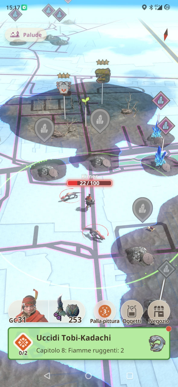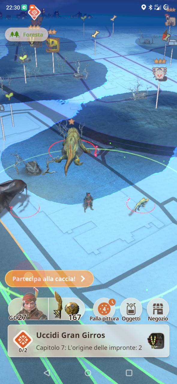Infatti in Monster Hunter Now le cacce non saranno da 50 minuti, ma da poco più di un minuto di tempo limite, che risulta comunque essere molto lungo considerando che si tratta di un titolo da giocare mentre si cammina in giro e per questo, nel caso siate di fretta o in un luogo piuttosto scomodo dove potervi fermare a combattere, potete marchiare il mostro incontrato con una palla-pittura e cacciarlo in un secondo momento.