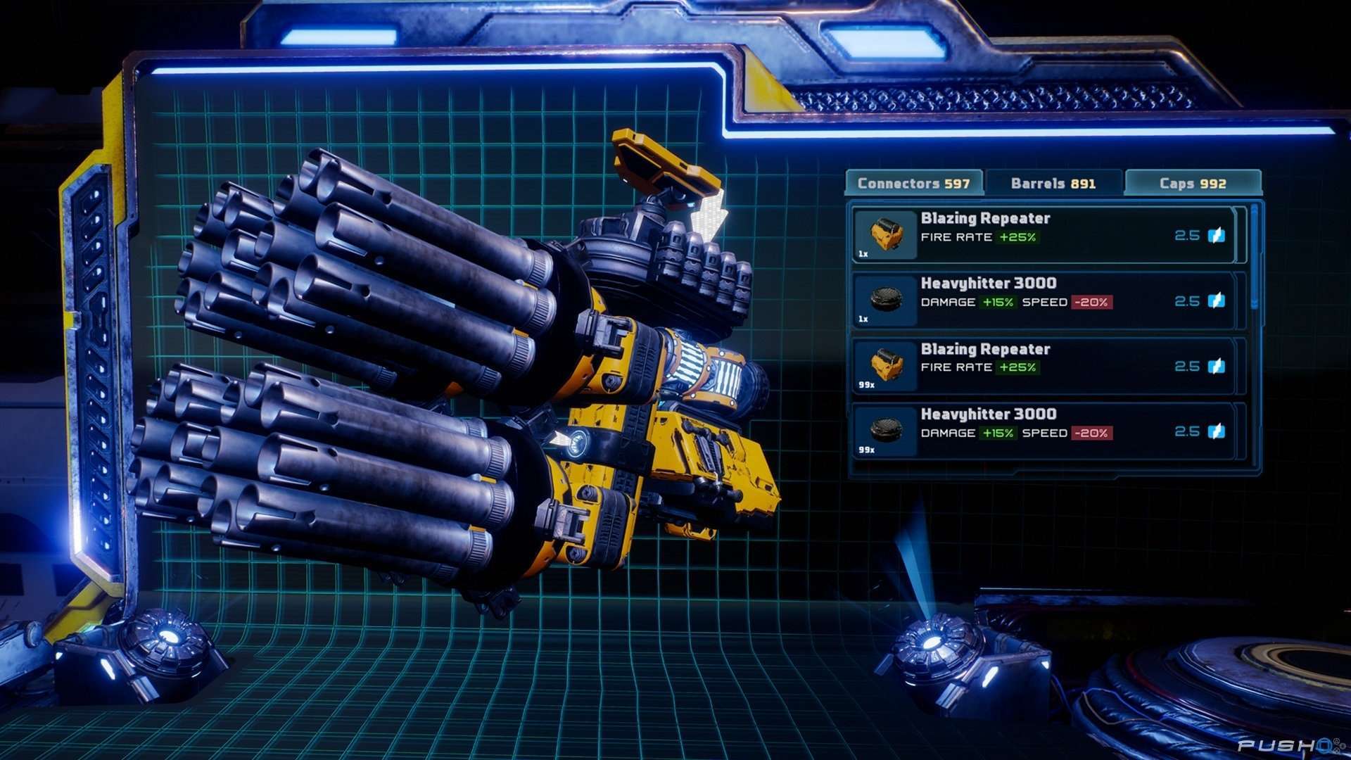 Il sistema di crafting, estremamente profondo e ben congenato, ci offre la possibilità di modificare tre aspetti delle armi che usiamo (mano destra e sinistra): Connettori, Potenziamenti, Bocche di Fuoco.