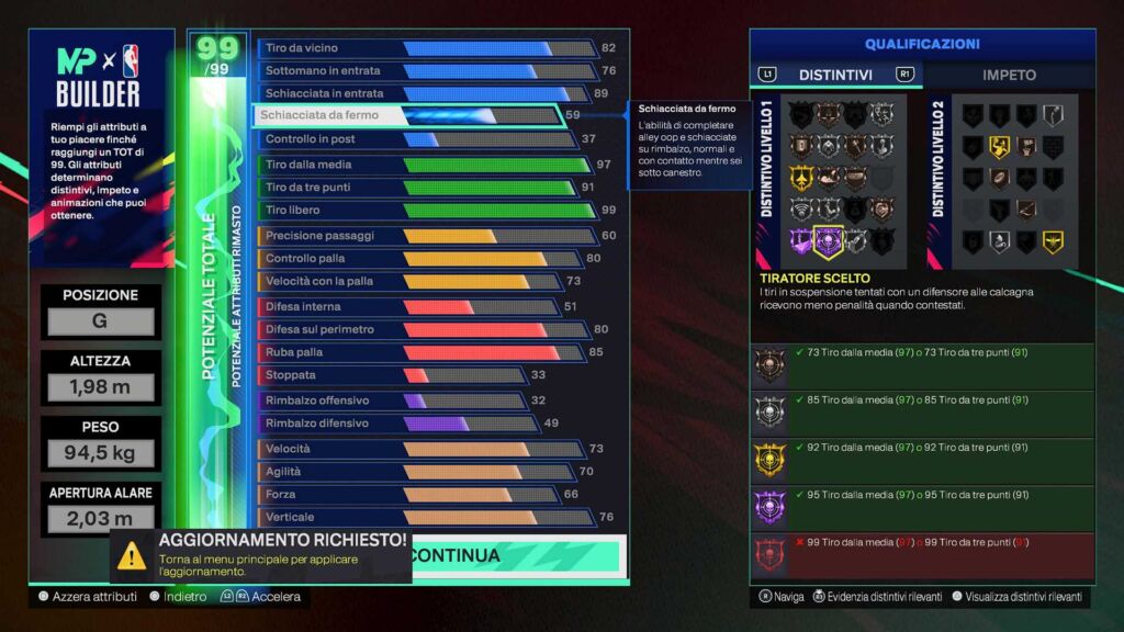 Una menzione la merita anche il builder del giocatore che permette di creare la nostra superstar nel modo più affine ai nostri gusti. Quando ho creato il mio giocatore, infatti, mi sono trovato a scegliere tra tre possibilità: build personalizzata, build creata dai professionisti e build NBA. La prima, come facilmente intuibile, è la classica di NBA 2K e permette di modificare ogni parametro del giocatore. La seconda, invece, mi ha mostrato una serie di build realizzate da professionisti secondo archetipi specifici di giocatore, mentre con l’ultima è possibile creare dei giocatori che hanno le stesse identiche caratteristiche dei giocatori più importanti dell’attuale NBA. Tutte e tre le alternative risultano scelte molto valide quando andiamo a creare il nostro giocatore e ci permettono di plasmare il campione perfetto per il nostro stile.