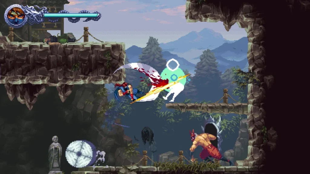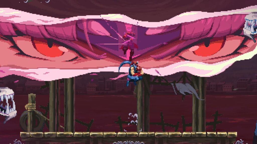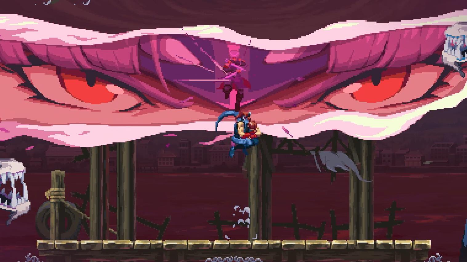 La pixel art di Ragebound è precisa e funzionale, priva di elementi superflui. Ogni scenario è costruito per sostenere il ritmo del gioco e mantenere alta la leggibilità dell’azione. I fondali variano in modo netto tra un livello e l’altro: templi in rovina, aree urbane devastate, grotte dalle geometrie irregolari. Ogni ambiente è caratterizzato da palette e illuminazione mirate a rendere immediatamente riconoscibili i punti d’interesse e i percorsi.