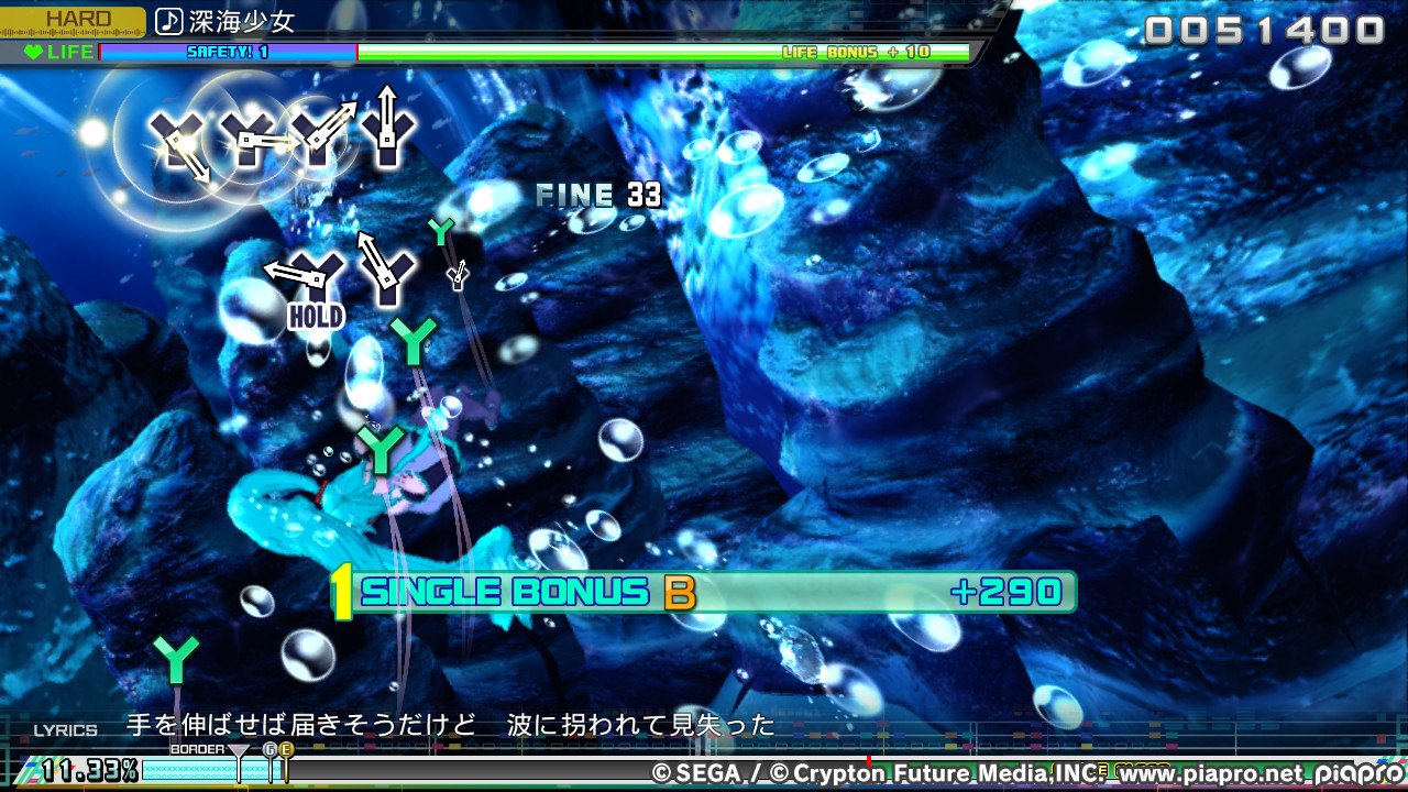 Perdere punti significa perdere terreno sulla barra situata nella parte bassa dello schermo che ci dà un’idea della nostra performance. Finire la canzone sotto la soglia minima richiesta ci indica una sconfitta, mentre, avendo successo, ci conferirà una medaglia in base alla percentuale di risultato ottenuta. Questi valori cambiano in base alla difficoltà selezionata, nella Normal ci basterà ottenere almeno il 50% della barra per avere successo. Ci verrà in questo modo conferita la medaglia di bronzo. Per ottenere valori più alti, dovremo arrivare al 75% per il silver, e 85% per il gold. Questi valori salgono per la difficoltà Hard, con un minimo di 60% di barra per considerare la track eseguita correttamente. Non ho ancora idea dei valori da raggiungere nelle due difficoltà Extreme… non mi sono ancora cimentato, ho già parecchie gatte da pelare con Hard.
