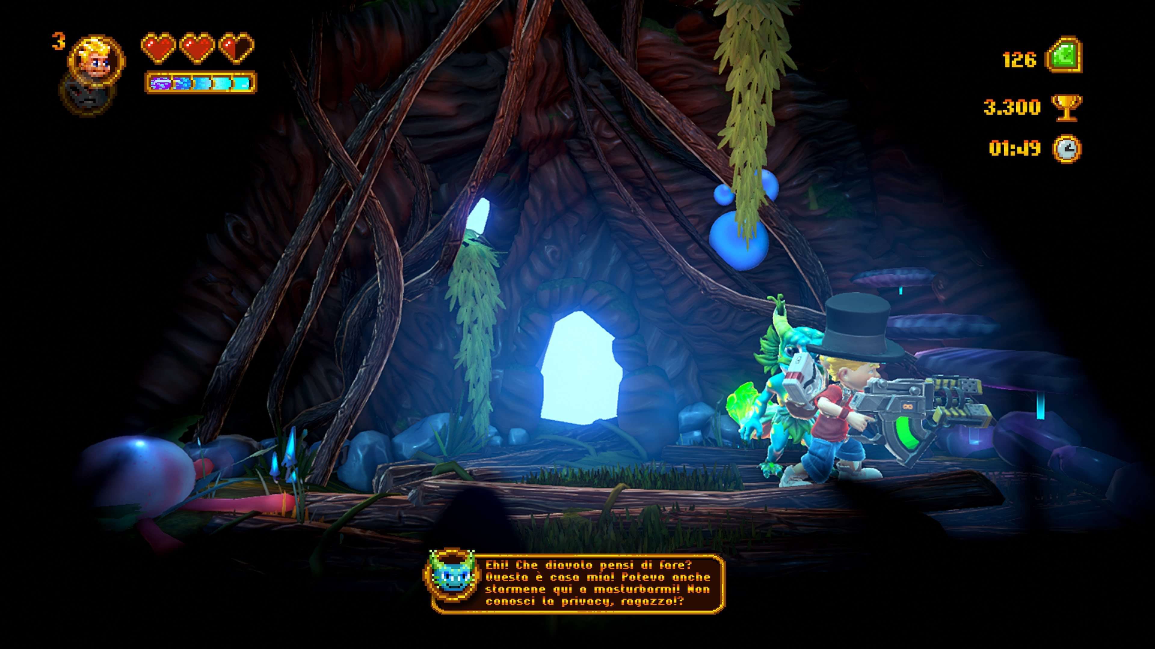 A tirarci su di morale dopo l’ennesima morte causata dalla mancata ottimizzazione delle collisioni ci penserà Dusty, che con le sue frasi sboccate rompe spesso la quarta parete, rivolgendosi direttamente ai giocatori. Il doppiaggio di Jon St. John, voce storica del Duca e con un curriculum infinito nel campo del voice-over, riesce a strappare più di un sorriso, rappresentando forse la parte migliore del pacchetto. È presente anche un filtro per disabilitare le parolacce ma vi consiglio di non attivarlo, la sconcezza e la volgarità sono parte integrante dello humour del titolo. Sempre parlando del lato tecnico sottolineo due buoni filmati in computer grafica, uno introduttivo e uno finale mentre, per quanto riguarda il gioco principale, la direzione artistica non mi è piaciuta più di tanto. I colori acidi e accesi, inseriti per omaggiare i platform del passato, a volte rendono la lettura dell’azione difficile e confusionaria. Anche i modelli dei personaggi risultano piuttosto anonimi, nonostante l’utilizzo di Unreal Engine 4 garantisca una buona mole poligonale e dei begli effetti grafici, ad esempio nella distruzione delle casse sparse per i livelli.