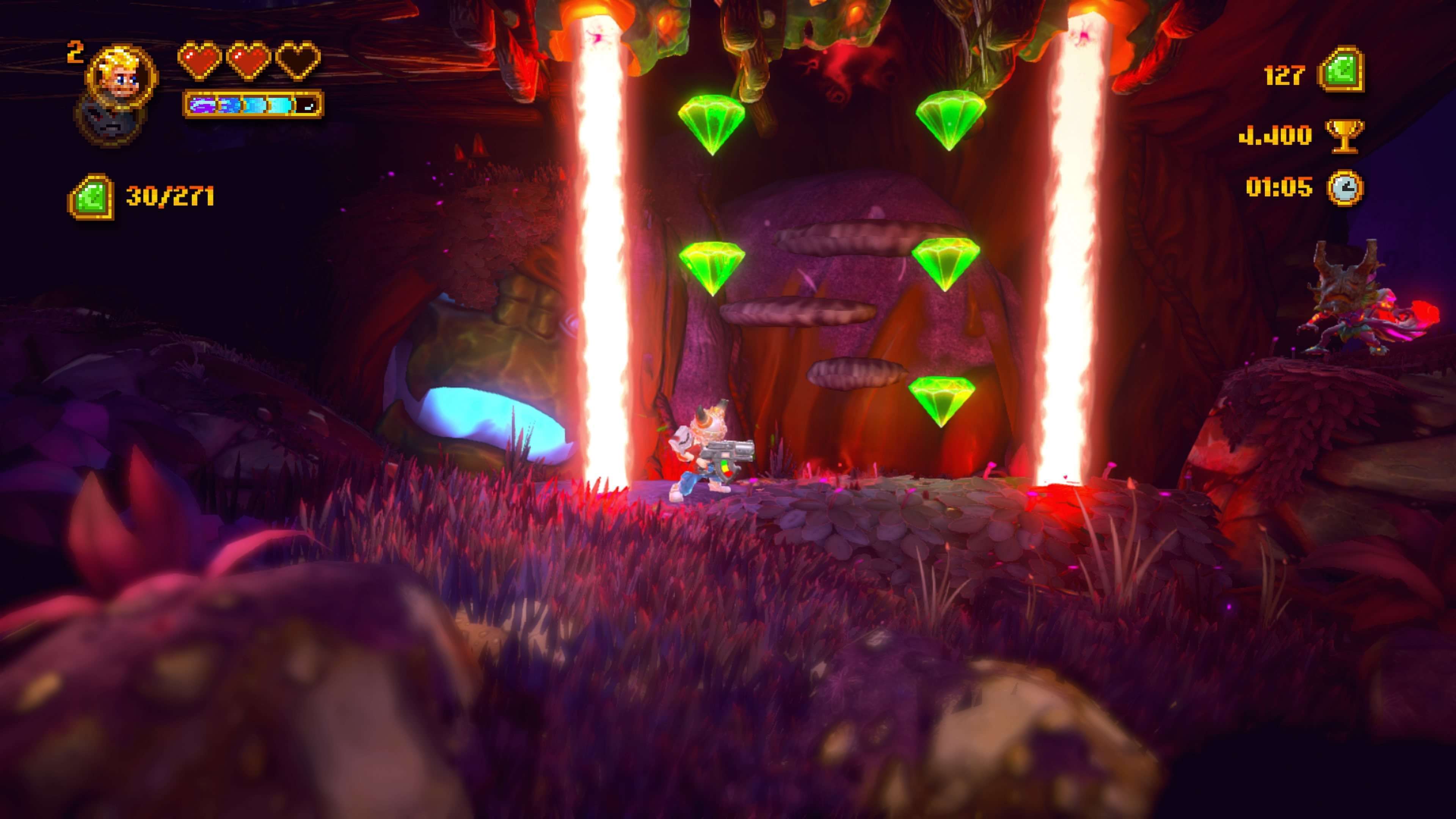 Se le fasi action si limitano a proporre soluzioni banali e già viste, le fasi platform non brillano certo per originalità. Tra piattaforme semoventi, a scomparsa, rocce che si sgretolano al nostro passaggio e raggi laser che si accendono a tempo, in Rad Rodgers c’è tutto il campionario del perfetto evangelista delle piattaforme. Per completare il pacchetto non potevano mancare i collezionabili, in questo caso dei diamanti verdi; raccogliendone cento otterremo una vita extra. Sparsi per i livelli ci sono anche dei cappelli, ma hanno solo fini estetici.
