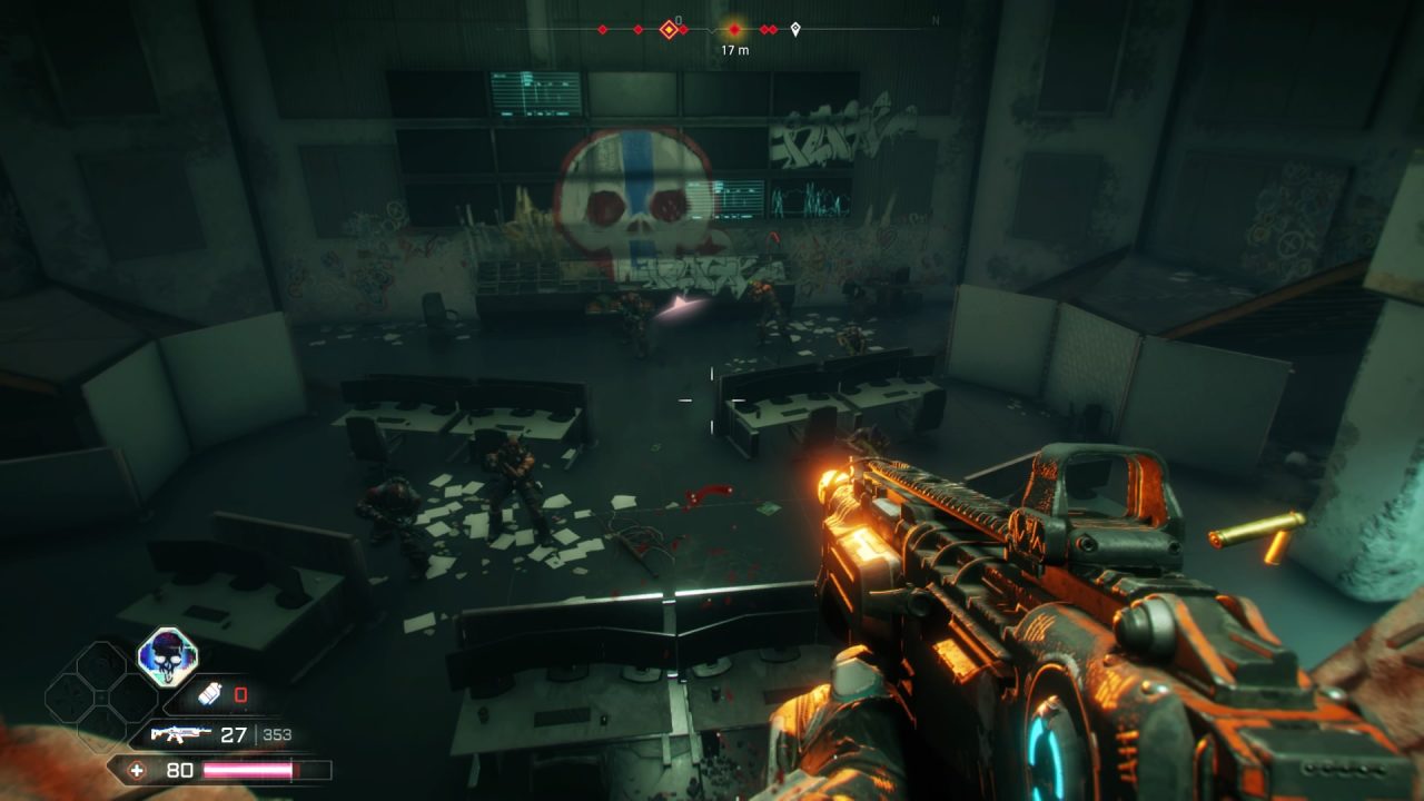 Questo sono le prime parole di felicità che abbiamo esclamato quando ho ucciso il primo nemico in Rage 2. Il gunplay è sicuramente il pilastro che sorregge questo gioco e, probabilmente, se non ci fosse stata la mano di ID Software non si sarebbero raggiunti gli stessi risultati. La ruota delle armi, che ne comprende 9, è funzionale e perfettamente bilanciata, offrendo più tipologie di armi diverse l’una dall’altra, proponendo così un’enorme quantità di approcci possibili al combattimento. Inoltre, ci sono armi che hanno un effetto secondario che le cambia totalmente, come il fucile da combattimento: normalmente è un fucile a pompa, ma mirando si trasforma in fucile di precisione che spara onde d’urto.