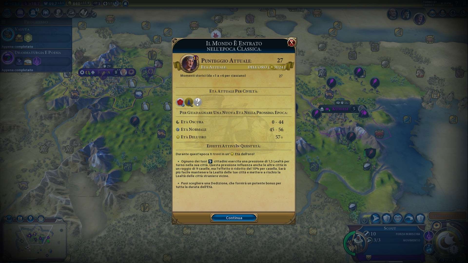 Questi punti (denominati Punti Epoca) andranno poi ad accumularsi in una barra, che potremo chiaramente osservare attorno al tasto delle azioni da compiere in basso a destra e ci permetterà di tenere traccia dei nostri progressi; infine i punti verranno sommati dopo alcuni turni dal passaggio di epoca di una delle civiltà presenti nel gioco. Una volta terminato il calcolo, i risultati potranno essere di tre tipi, a seconda della quantità di punteggio accumulata: un’Età Oscura, Normale o dell’Oro. La differenza principale fra queste età è la pressione di Lealtà: più i tempi saranno migliori, più le città saranno non solo più facili da mantenere, ma diverranno anche più capaci di influenzare gli insediamenti vicini.