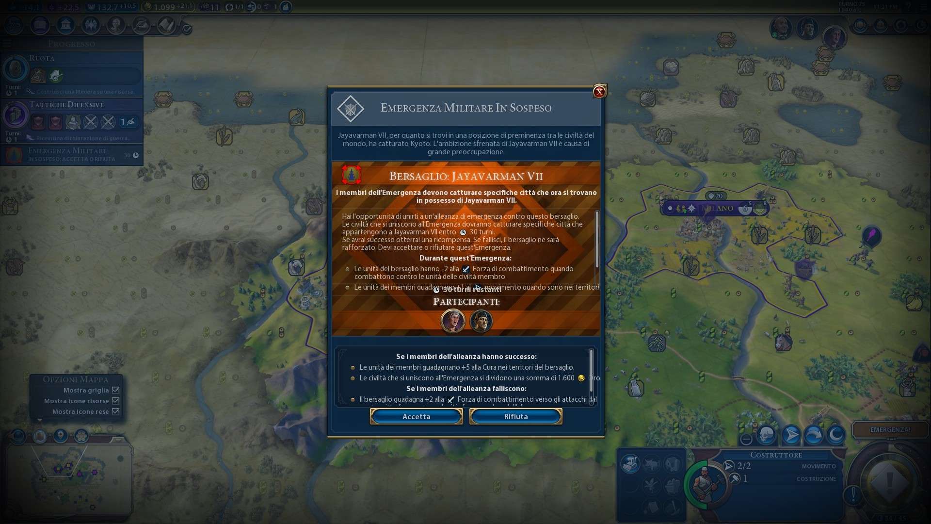Ultime, ma non meno importanti, sono le Emergenze: nel caso uno dei giocatori cominci a compiere azioni eccessivamente aggressive come, ad esempio: conquistare capitali di altri imperi, convertire città sante, sganciare bombe atomiche a tradimento (salve, Signor Gandhi) il gioco proporrà a tutte le altre civiltà una missione a tempo la quale, se portata a termine con successo, garantisce a chiunque partecipi un’enorme ricompensa (Fede, Scienza od Oro a palate, ad esempio) con un “piccolo insignificante” caveat: in caso di fallimento, chi subisce l’emergenza si prende un malloppo tanto grande quanto quello promesso a chi la affronta.