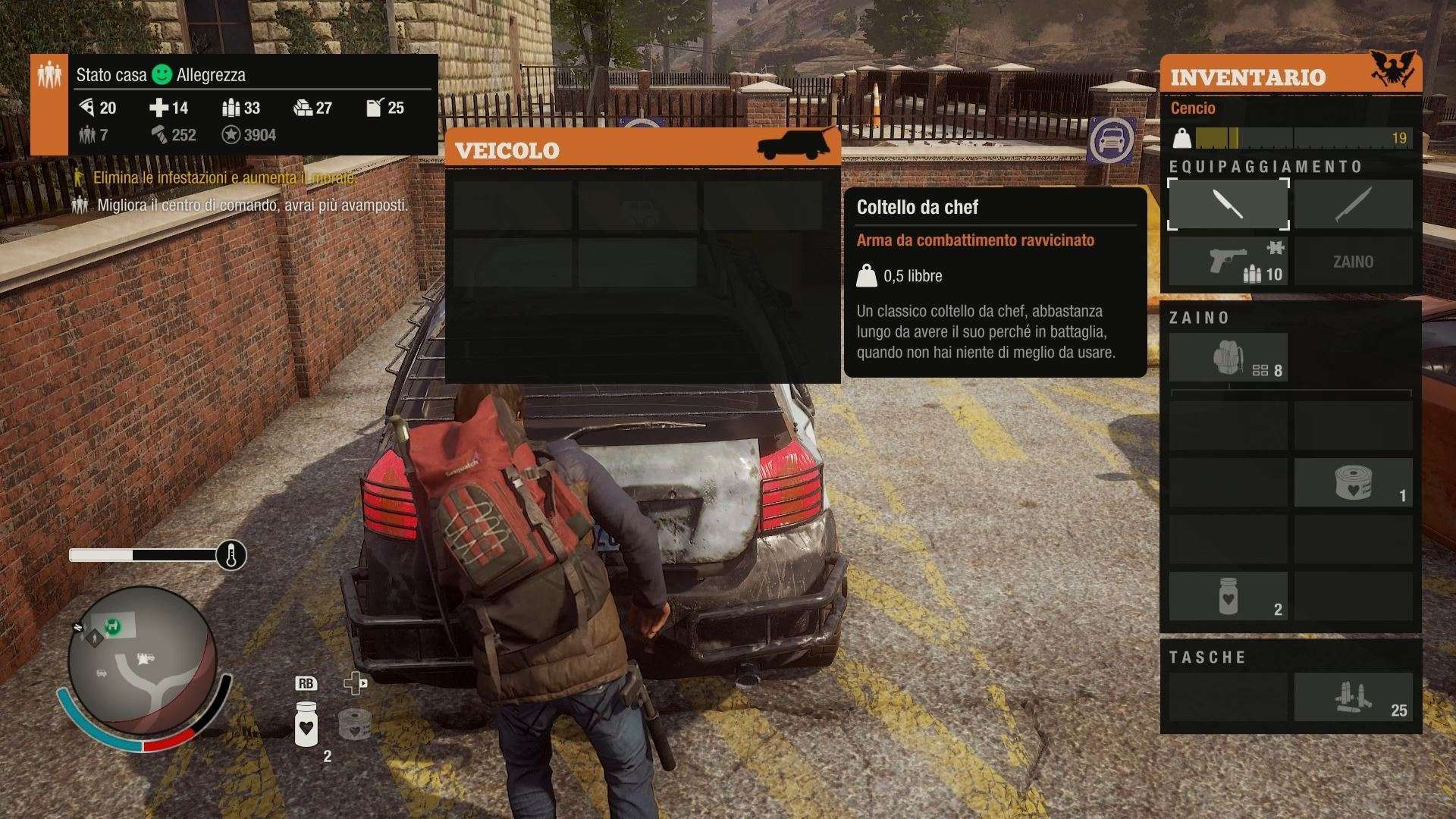 Altra cosa che mi dà un buon senso di pressione, ma che al tempo stesso mi lascia abbastanza perplesso, è la gestione degli inventari. Premettendo che vi converrà sempre andare in giro in macchina, dato che potrete mettere nel baule i pack delle risorse (a piedi sarete obbligati a riportarli uno alla volta nella vostra base principale), avrete a disposizione dai sei agli otto slot per lo zaino e un numero variabile di slot a seconda del mezzo che state usando. Ora, a parte che molti bauli di automobili hanno meno capienza degli zaini (!), trovo assurdo che un foglio di carta mi occupi lo stesso volume di una trapanatrice da laboratorio. Non sarebbe stata meglio una gestione inventariale stile quella di Resident Evil, dove ogni oggetto occupa un determinato spazio?