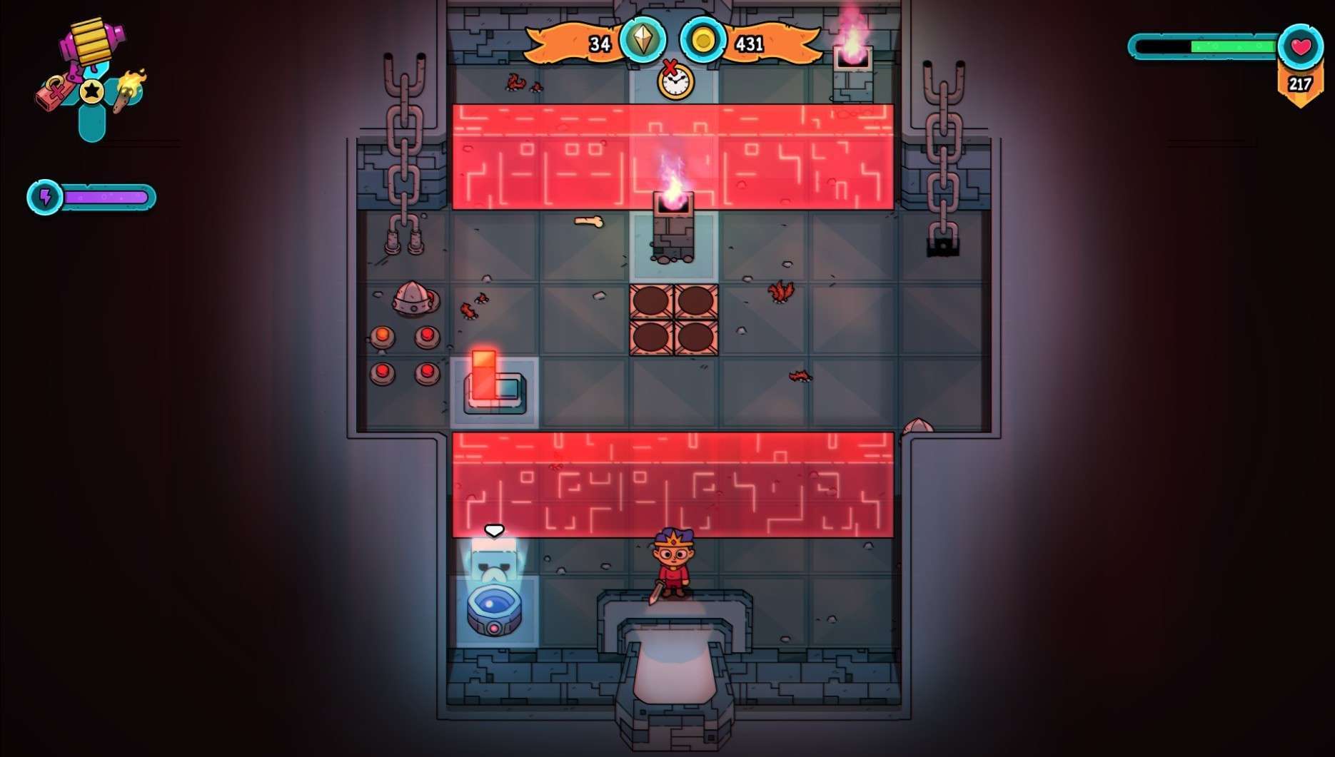 Il mondo di gioco ha una buona dose di segreti e, tolto l’inizio di una nuova run dove saremo obbligati a raccogliere la spada dalla tomba del suo ex possessore, è un piacere scoprire la mappa e cosa ha in serbo per noi. Purtroppo i dungeon (veri e propri sotterranei caratterizzati da puzzle e regole che ne modificano leggermente il gameplay) e le caverne (monostanze con un singolo puzzle/nemico/scrigno) si assomigliano un po’ tutti, sia visivamente che nella risoluzione degli stessi.