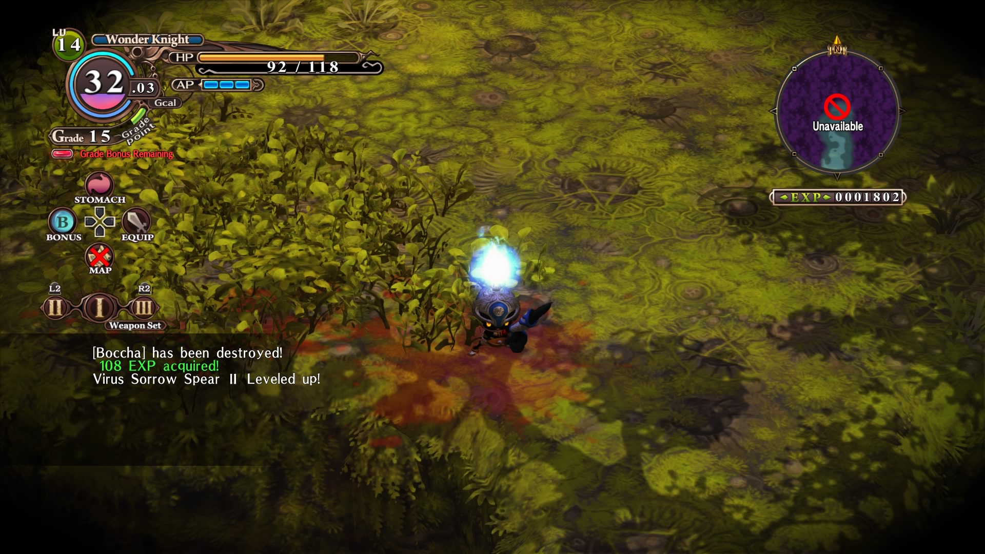 Attitudine che, ad onor del vero, si esprime anche nel gameplay dove, prendendo il controllo dell’Hundred Knight, dovremmo muoverci attraverso mappe\dungeon con visuale dall’alto e sebbene il compito di base sia quello di dirigersi dal punto A al punto B(oss), c’è da dire che la linearità è ridotta all’osso poiché, durante tutto il peregrinare, la piccola ed agguerrita creatura potrà esplorare l’ambiente circostante al fine di recuperare loot utile alla bisogna, sconfiggendo un numero più alto possibile di nemici da tramutare in preziosi punti esperienza. Il tutto però è da svolgersi con una certa fretta: non potremo restare all’infinito in una mappa, poiché con lo scorrere del tempo, o ancor peggio durante la rigenerazione dei punti salute e della stamina, l’Hundred Knight consumerà Gigacalorie, necessarie a far ardere la fiamma sul suo elmo, elemento d’importanza vitale per mantenerlo nel mondo dei vivi.
