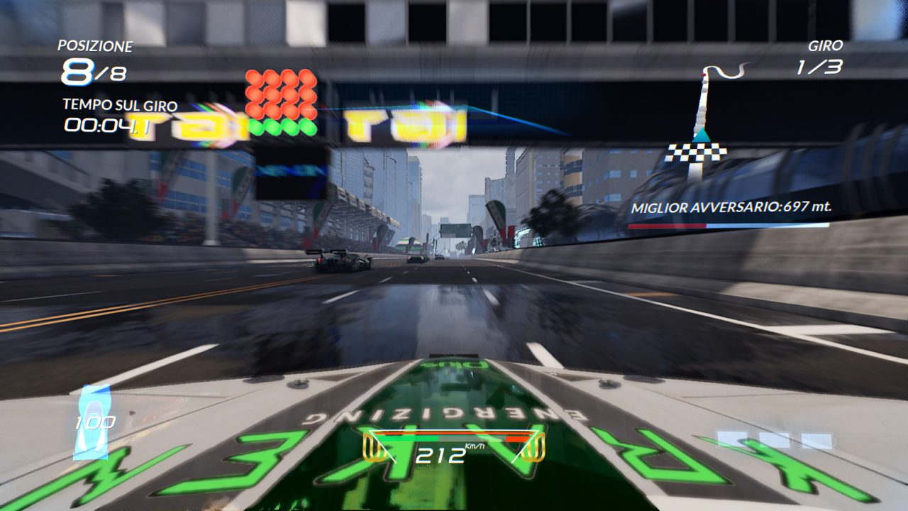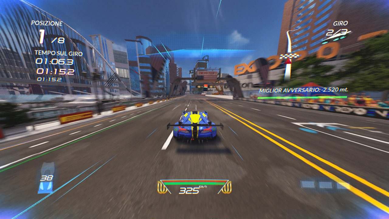 Una volta terminato il video introduttivo, nel quale viene illustrato il contesto che ho appena descritto, avrà inizio un breve tutorial, che si esaurisce in poco più di un minuto. D’altronde ci troviamo di fronte a un racing game estremamente arcade, che ha come tratto distintivo il boost, ricaricabile attraversando delle sezioni blu della pista o semplicemente derapando, ma ci torneremo dopo.