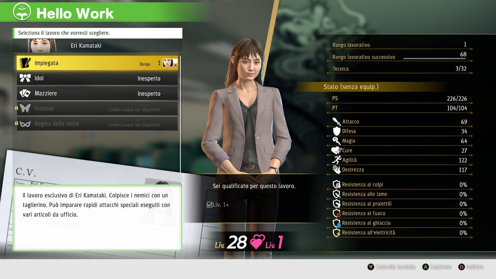 Yakuza: Like a Dragon porta una ventata d’aria fresca nella saga, adottando un sistema JRPG, abbandonando così un sistema efficace ma molto rozzo e poco approfondito che veniva implementato nei capitoli precedenti della saga. Questo porta con sé l’aggiunta di classi a cui ogni personaggio può accedere, partendo da quelle esclusive per ognuno di essi, fino a quelle impersonabili da tutti, chiamati Lavori. Sì, perché in questo caso tutto ruota attorno ad un’agenzia di collocamento che ci metterà in contatto con varie aziende/locali per ottenere un lavoro, che è ciò che va poi a definire le abilità e statistiche, e dovremo passare per la suddetta (Hello Work) ogni qualvolta vorremo scegliere un lavoro diverso.